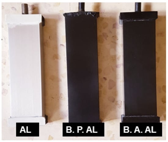 The designed water containers were as follows: two anodized commercial Al, silvery color, denoted (Al); three matte black painted silvery commercial Al (Glance spray paint, matte black 20 (UAE)), denoted (B. P. Al); one commercial blackened anodized Al, denoted (B. A. Al). All Al sheets were purchased from the local market in Amman, Jordan. Black painting of Al was performed by spraying twice to obtain a homogeneous layer with a thickness suitable to absorb solar radiation with high efficiency. The thickness of all Al containers was approximately 1 mm. Essential information regarding the anodization process is given in Section 4.2. Figure 1 shows the three types of water containers, Al, B. P. Al, and B. A. Al.