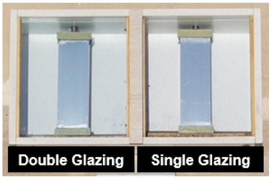Two identical wooden boxes with dimensions of 62 cm (length), 32 cm (height), and 15 cm (depth) were used in all experiments to house the aluminum systems. They had double-glazed front sides with air gaps of approximately 1 cm between two commercial glass sheets of 3 mm thickness for better insulation against the ambient environment. Each box was divided into two rooms using a wooden partition of approximately 3.5 cm thickness for good thermal insulation. The thickness of the wood used for the box’s construction was approximately 1.7 cm. The cover glasses were removable, so that the boxes could be used for single- or double-glazing tests, and also to facilitate the insertion and removal of water containers intended for solar heating. Six water containers of commercial Al with dimensions of 8 cm width, 4 cm depth, and 28 cm height were inserted. The Al tubes were rectangular in shape, corresponding to that usually used in building construction.