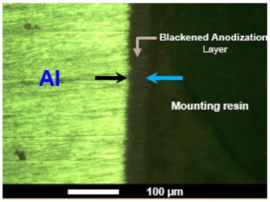 Optical microscope images revealed that the thickness of the blackened anodization layer of the commercial Al was approximately 14 µm, as revealed in Figure 3, and the thickness was almost homogenous.