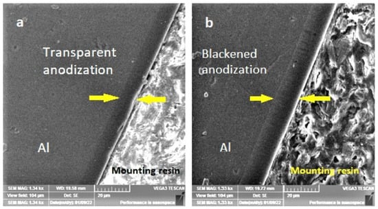 As seen in Figure 5, the thicknesses of the transparent and blackened anodized layers were approximately 14 µm and 11 µm, respectively, as measured more precisely from the SEM images. These values matched well with the values measured from the OM images. This difference in the thickness of anodization was due to the blackening step that follows the anodization process of Al, as required.