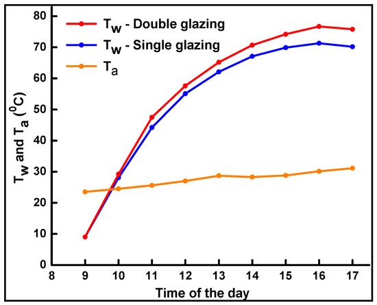 It is obvious from Figure 6 that, generally, double glazing was more feasible to apply in the manufacturing of SWHS, as it collected more solar energy in comparison with the single glazing. As seen from the figure, the temperature difference between the single and double glazing was approximately 5 °C in favor of the double glazing. The logical reason for this result is that the air gap between the two panes in the double-glazed system provided better thermal insulation, as a result capturing more solar energy and losing less thermal energy during the duration of solar exposure.