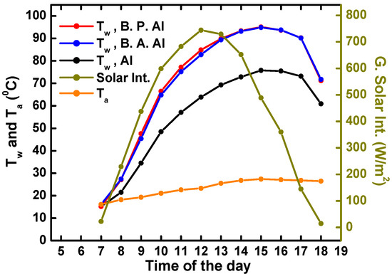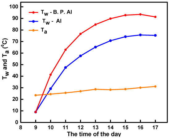 On the same day above, Al and B. P. Al water containers were filled with cold tap water of approximately 9 °C and exposed to solar radiation from 9:00 to 17:00. Tw and Ta were measured hourly and are presented in the Section 4.
