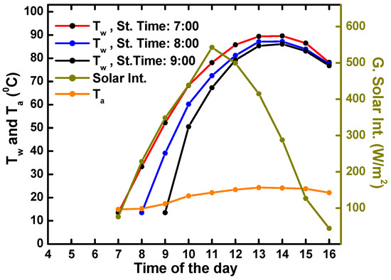 Figure 9 shows that even when varying the starting time of solar heating, the maximum temperatures for the three cases were very close, and they were almost equal at the end of the experiment. The starting Tw for all cases was approximately 13.5 °C, the mean value of Ta was approximately 21 °C, and the mean value of the global solar intensity was approximately 300 W/m2 during the measurement period. This result is very important in terms of utilizing solar energy for water heating. Thus, it is possible to drain the hot water at a certain time when needed, and then obtain a high temperature later as well when the system is refilled again with cold water. Hence, the collected solar energy per unit of time could increase.