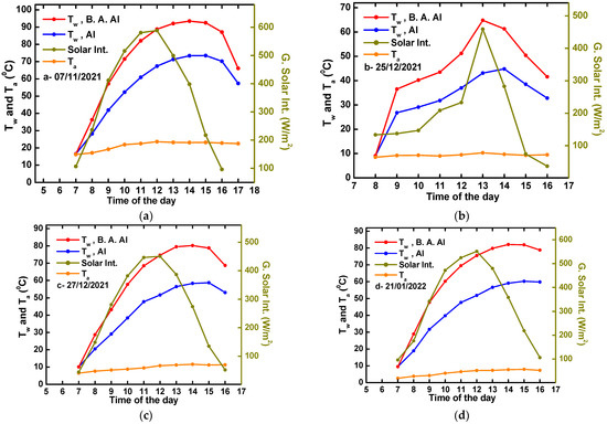 Generally, it can be seen from Figure 10a–d that the weather conditions affected the water temperature, but not to the degree of not gaining high water temperatures. In addition, the figure confirms that even when the ambient temperature is low, a maximum water temperature of approximately 80 °C could be reached, as seen in Figure 10d.