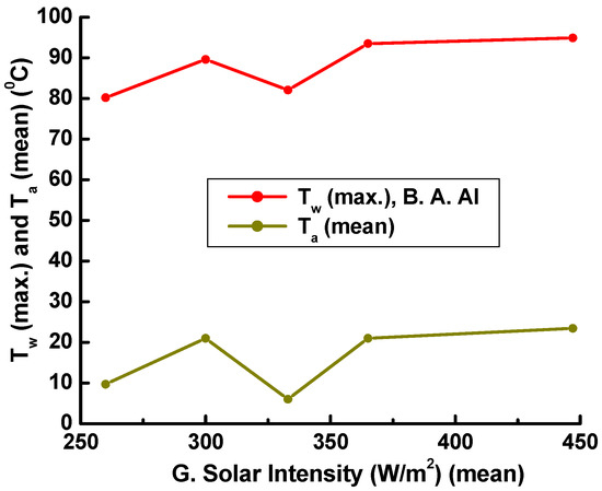 The effect of weather change on the outcome of the employed solar heating system is exposed in Figure 11. It can be concluded from the figure that the maximum water temperature was generally proportional with the global solar intensity when the system was well isolated from the external environment by front double-glazing. The ambient temperatures were mostly directly proportional to the global solar intensities. However, the figure revealed a special case in the valley point of approximately 333 W/m2 global solar intensity, when the mean value of the ambient temperature was approximately 6 °C, which was due to the general weather conditions on that day. The research was conducted over two seasons (autumn and winter). We did not notice any performance change or material stability effects due to the variation in temperatures seen in the results. We also noticed that solar absorptivity did not change with time over many experiments.