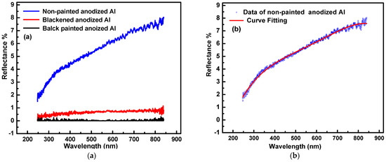 (a) Reflectance % of the three used selective surfaces, Al, B. A. Al, and B. P. Al, vs. the applied spectrum; (b) The curve fitting for the Al surface was found to be of the fourth-degree polynomial relation, such that.