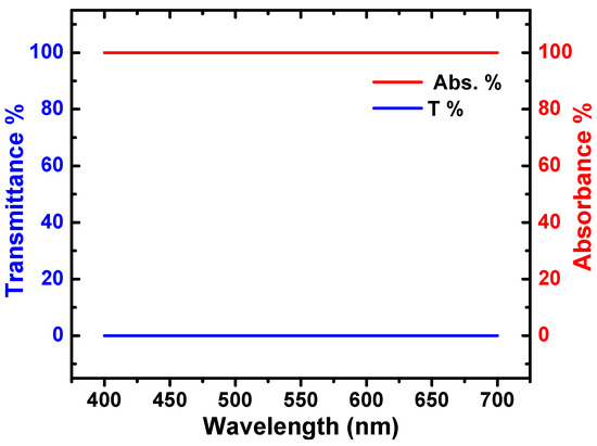 Figure 13 reveals the relationship between the T% and Abs.% of the used matte black paint as a function of wavelength in the visible light range, from which it can be concluded that the thickness of the paint applied to the Al water containers was perfect for solar radiation absorption, as its T% was almost zero and Abs.% was nearly 100%. This test proved that the solar absorption of the blackened anodized selective surface was well comparable with the used matte black paint, as the obtained water temperatures were similar. Therefore, the blackened anodized Al is recommended to be used for SWHS manufacturing as a suitable solar selective surface with excellent corrosion resistance, as will be confirmed in the corrosion part of the discussion.