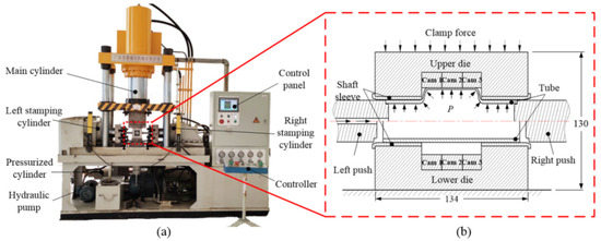The connection experiments were performed on a hydraulic machine with a CNC system (YB98-200A from Guangdong Sihao Hydraulic Technology Co., Ltd., Foshan, Guangdong, China), as shown in Figure 2a. The connection of the camshaft is mainly completed by the main cylinder, the left and right stamping cylinders, the control panel, the hydraulic pump, the pressurized cylinder, the left and right punches and the THF die. The punches are installed on the left and right stamping cylinders, and the stamping cylinders realize left and right synchronized feed movement of the punches. The purpose is to provide sealing to both ends of the tube. The hydraulic pump (4DSY-22/60 from Shenmo Electric Co., Ltd., Shanghai, China) and the pressurized cylinder provide hydraulic pressure for the camshaft connection test. The inside of the tube is filled with fluid through the left punch hole, causing the tube to plastically deform. Hydraulic pressure is applied by the control panel, which also applies variation of hydraulic pressure with time. In the hydroforming system, the rated maximum hydraulic pressure is 85 MPa. The synchronization accuracy of the left and right stamping cylinders is not greater than 0.1 mm. The THF principle of the equipment is demonstrated in Figure 2b. First, the cam and tube are placed and fixed between the upper and bottom dies. Second, the upper and lower dies are clamped by the pressure of the main cylinder to fix the cam and the tube. Third, the left and right punches move the left and right to provide sealing to the ends of the tube, filling the tube with fluid through the left punch hole to provide hydraulic pressure. Finally, the cam and tube are assembled under different hydraulic pressures.