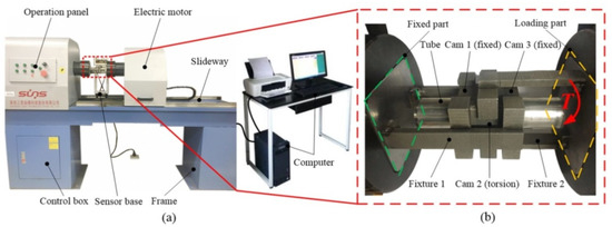 The equipment used for orthogonal torsion experiment of camshaft is TTM502-A1 electronic torsion test rig produced by Shenzhen Sansi Zongheng Technology Co., Ltd. (Shenzhen, Guangdong, China), as shown in Figure 3a. The measuring range of the torque is 1–100% FS (full scale). The relative error of the torque, torsion angle and torsion angle of the torsion meter are ±0.5%, ±1.0%, and ±1.0%, respectively. The torsion velocity range is 4–720 °/min, and the relative error of the torsion velocity is within ±1.0% of the set value. This can be used for torsion performance experiment on metal materials, non-metallic materials, composite materials and components. Since the camshaft in this study is a hollow structure, considering the installation problem, a set of torsion fixtures is self-designed, as demonstrated in Figure 3b. During this torsion experiment, cams 1 and 3 were fixed, cam 2 was torqued, and the torsion strengths between cam 2 and tube were obtained and recorded in real-time using the computer acquisition software.
