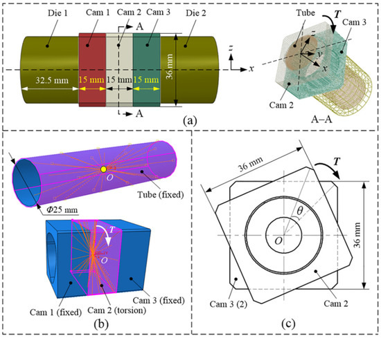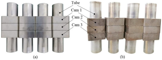 The outer shape of the cam was designed as a square structure with a length of 36 mm (Figure 1c). To facilitate the subsequent analysis, three identical cams with a thickness of 15 mm were designed in this study (Figure 1a). The diameters Di and De of the small and big circles were 25.3 and 28.5 mm, respectively (Figure 1b), and the offset distance e of the cam was 0.8 mm. The length, diameter and wall thickness of the tube were 110, 25 and 0.6 mm, respectively. The materials of the tube and cam were SUS304 stainless steel and 45 steel, respectively. The chemical composition of the two materials is listed in Table 1. Table 2 presents the material mechanical parameters of the tube and the cam.