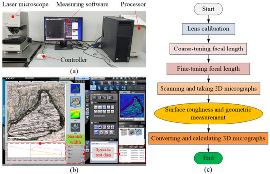 The main measurement procedure is displayed in Figure 5c, including the following processes: First, the focal length of the micro lens is roughly adjusted. The measuring surface of the tube is placed in the middle of the stage. The lens is aligned with the measurement area by mouse and controller. Then, the focal length of the instrument lens is fine-tuned by adjusting the mouse wheel until the outline is clear, so as to obtain a clear focal length range. Subsequently, the appropriate focal length is selected and the measurement button is clicked. The system scans and calculates the sample contour through the microscope lens. According to the obtained two-dimensional micrograph, the surface roughness and geometric measurement buttons are clicked, respectively, the appropriate area to calculate the surface roughness and scratch width is selected, and finally the relevant data are obtained as listed in Table 5. To reduce measurement error, scanning, measurement and calculation are carried out three times on the tubular outer surface at the same position. Finally, to obtain better morphology, the 2D micrograph is converted into 3D morphology. The measurement software interface is shown in Figure 5b.