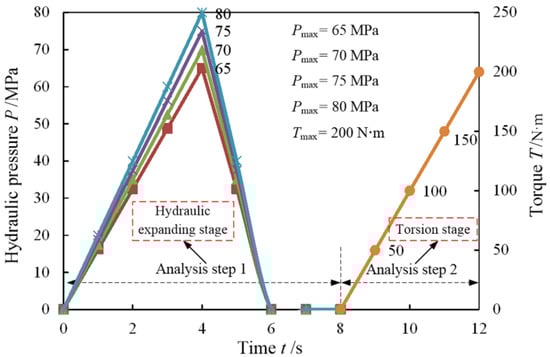 Because the individual parameters and samples required by the BP neural network cannot be directly obtained from the above experiments, the purpose of this finite element analysis (FEA) is to extract the residual contact pressure and shear stress values for building an accurate BP neural network model. The FE model of hydraulic expanding assembled camshaft is established using ABAQUS 6.14 software, as shown in Figure 6a, which mainly includes four parts: cam, tube, left die and right die. The structure, materials and process parameters are consistent with the above experiment. For example, the hydraulic pressure is 65, 70, 75 and 80 MPa, and the loading path adopts linear loading and is consistent with the above experiments, as presented in Figure 7. Two analysis steps are set in this simulation. The first step time is 0–8 s, and the tube is mainly assembled with the cam under the hydraulic pressure and finally the process of hydraulic pressure release and rebound. The second step is 9–12 s; the assembled camshaft is subjected to a torsion analysis under different conditions, and the torque is increased linearly with a maximum of 200 N·m in this FEA. Particularly, the setting of the torsion was important in the second step. Cams 1 and 3 were fixed, and cam 2 was torqued. First, a center point was created at the center of cam 2, and the center axis of the geometric model passed through the center point. Subsequently, the outer surface of cam 2 was coupled with its center point, i.e., a coupling relationship was established between the outer surface and the center point. Next, an appropriate spatial coordinate system O-xyz was established at the same center point of cam 2, and the torque about the center axis was applied to cam 2 (Figure 6b). Finally, the torsion angle θ of the cam was obtained by outputting the angular displacement of the center point in ABAQUS 6.14 software, as shown in Figure 6c. Furthermore, Standard/Explicit was used to analyze the model, which significantly saved the simulation time and improved the calculation accuracy.