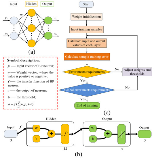 where n, ni and no represent the number of nodes in the hidden layer, input layer and output layer, respectively; a is the adjustment constant, which is usually selected between [1,10]. In this study, the BP neural network has only one hidden layer, and according to Equation (4), the number of hidden layer nodes is 12.