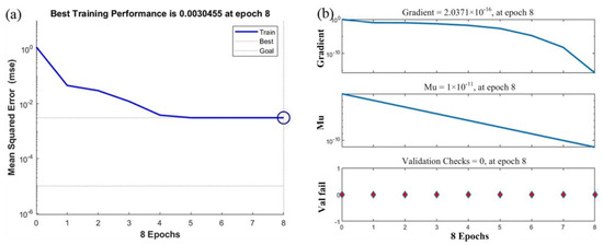 The learning of BP neural network is essentially the training of the BP algorithm, namely, learning and correcting the thresholds and weights of the neural network algorithm through a large number of test samples. It is an important process for establishing an accurate neural network model. The neural network toolbox in MATLAB automatically divides the data into two parts: training and testing, in the process of training the network. The specific learning and training steps are demonstrated in Figure 8c.