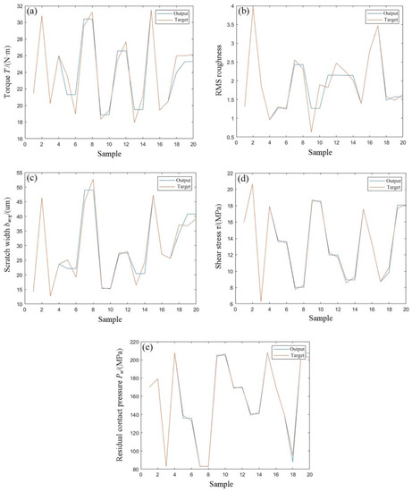 Using the above training function as the BP neural network model after training, the last three groups of test samples shown in Table 5 are simulated. After the simulation, the output results of torque, surface roughness, scratch width, shear stress and residual contact pressure are displayed in the same picture as the target value in Figure 11. The output values corresponding to the 17 groups of samples are the results of training 17 groups of training samples with the BP neural network, and the output values of the last three groups of samples are the predicted output values obtained using simulation of the BP neural network obtained through training. The prediction results, target values and relative error values of three test samples, 18, 19 and 20, obtained using the BP neural network simulation are listed in Table 7. It can be seen from Table 7 that the maximum relative error of torque prediction value is −6.97%; the maximum relative error of surface roughness prediction value is 5.75%; the maximum relative error of scratch width prediction value is 8.34%; the maximum relative error of shear stress prediction value is −7.63%, and the maximum relative error of residual contact pressure prediction value is −6.61%. As a whole, the fitting degree between the training results of the five output parameters and the target value can be obtained. The fitting degree of torque and scratch width is relatively poor, and the prediction accuracy of shear stress and residual contact pressure is higher. The prediction accuracy of all prediction results is more than 91%, and the highest prediction accuracy can reach 99.78%.