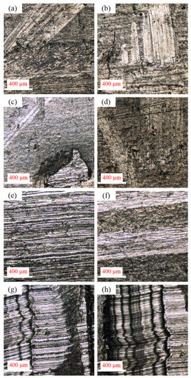 To see the partial failure manifestation more clearly and intuitively, a 2D microscopic image of the tubular outer surface was obtained with the OLYMPUS OLS4100 3D measuring laser microscope, as shown in Figure 12. After the orthogonal torsion experiment under different conditions, there are different degrees of scratches on the tubular outer surface. Most of these scratches are generated along the torsion direction; some are regular; some are disordered, and the width and depth of these scratches have a vital impact on the accumulation of surface damage. Once there are scratches on the tubular surface, the surface roughness changes accordingly, gradually accumulating and finally developing surface damage, which causes the relative sliding between cam and tube and leads to the failure generation of the assembled camshaft.