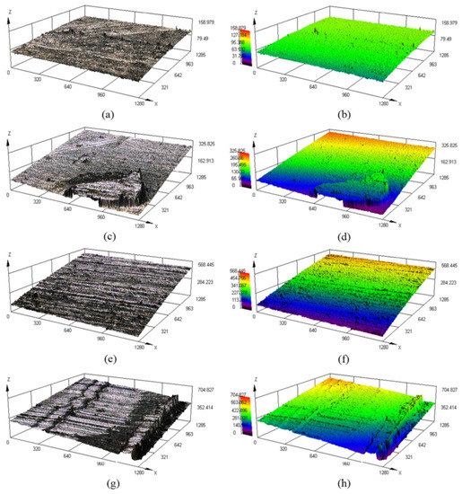The 3D failure manifestations of the outer surface of the tube in Figure 12a,c,e,g are displayed in Figure 13, and the failure manifestations of the assembled camshaft can be observed more intuitively, that is, failures such as wear, scratch, damage, hole, pit and distortion on the tubular surface.