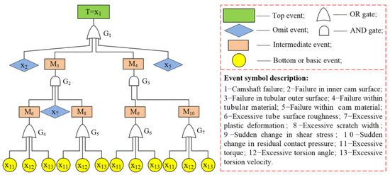 Quantitatively, the probability of the top event can be calculated from the primary and basic events regarding the minimal cut sets. The quantitative evaluation of failure trees can determine the probability of occurrence of the top event. To further determine the possible combined failure modes of assembled camshafts, based on the FT theory, the minimum cut set of the system is obtained. The expression of the minimum cut set can be obtained as: