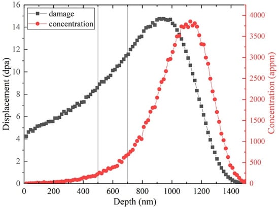 The self-ion irradiation experiment of FeCrAl alloy was conducted on the 320 kV highly charged ion comprehensive experimental platform of Institute of modern physics, Chinese Academy of Sciences. Figure 1 illustrates the damage and ion concentration profile of material calculated using SRIM-2013 code, where the displacement energy of the Fe atom is 40 eV. The damage peak is located in ~900 nm and the ion concentration peak is at ~1100 nm. In order to minimize surface effects, the sample should be observed in a sufficiently deep area. In addition, to avoid injected ion effect, the observation area where injected self-ion concentration is lower than 100 appm/dpa (<0.01%/dpa) should be chosen [13]. The transmission electron microscope (TEM) observation area is selected to be 500–700 nm from the irradiation implantation surface.