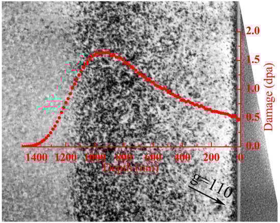 Bright field TEM micrographs of FeCrAl alloy under the condition of [001] pole, = −110, and the displacement damage distribution calculated by SRIM irradiated by 3.2 MeV Fe13+ ion with the fluence of 1.9 × 1015 cm−2.