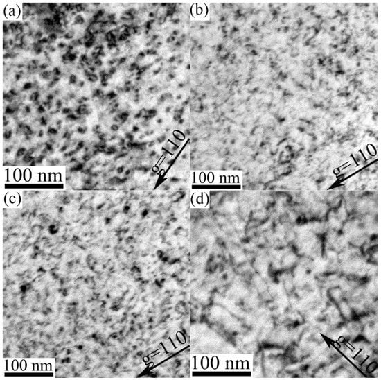 Bright field TEM micrographs of Y−FeCrAl alloy in the 500–700 nm depth under the condition of [001] pole, = −110, the damage dose is (a) 1.0 dpa (b) 2.5 dpa, (c) 5.0 dpa, (d) 10.0 dpa.
