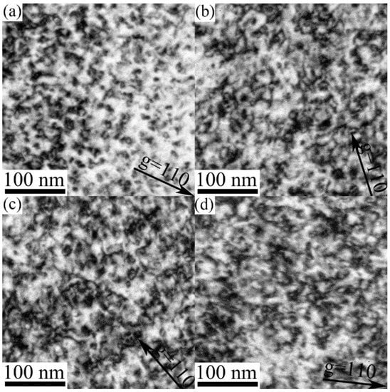 The TEM images with higher magnification in the region of 500–700 nm depth are showed in Figure 3 and Figure 4. The corresponding average displacement damage is 1.0 dpa, 2.5 dpa, 5.0 dpa and 10.0 dpa. With the increase of dose, the size of the dislocation loop increases and the dislocation network intensifies.