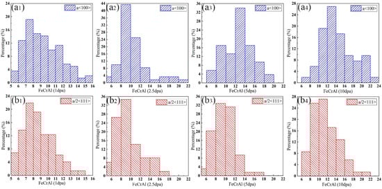 Size distribution of (a1–a4) a<100> dislocation loops, and (b1–b4) a/2<111> dislocation loops in Y−FeCrAl alloy after irradiation to 1.0 dpa, 2.5 dpa, 5.0 dpa and 10.0 dpa.