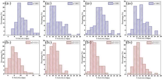 Dislocation loops of a/2<111> and a<100> were induced in FeCrAl and Y−FeCrAl alloys at all doses. Figure 5 shows the size distribution of a<100> and a/2<111> dislocation loops in FeCrAl alloys at different doses. It is found that the size distribution peak moves to the larger size direction and the size distribution is wider as the radiation dose is increased. Further, the size distribution of the a<100> loop moves to the larger size direction and appears wider than that of the 1/2<111> loop under all doses.