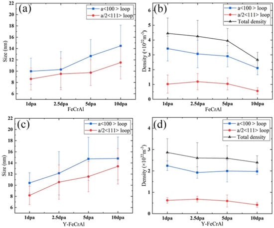 (a) average size and (b) density of dislocation loop in FeCrAl alloys, (c) average size and (d) density of dislocation loop in Y−FeCrAl alloys.