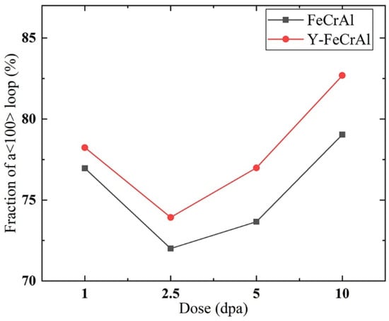 Figure 7 shows that the proportion of a<100> dislocation loops increases after the addition of element Y, which is contrary to the effect of Cr. Cr mainly inhibits the merging of a/2<111> loops to form <100> loops by limiting the movement of a/2<111> loops [31]. As a large-size solute, Y may play an indispensable role in the formation and growth of dislocation loops [29]. Due to the high binding energy between Y atom and vacancy [40], Y can directly occupy the vacancy to inhibit swelling [16]. The combination of Y and vacancy increases the number of surviving interstitial atoms and defect clusters, thus promoting the process of loop–loop merging and loop growth by absorbing interstitials. As a result, the average size of dislocation loops in Y−FeCrAl alloy is larger and the density is lower than that of FeCrAl alloys.