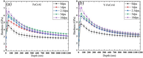 The depth profile of the average hardness data of unirradiated (0 dpa) and irradiated specimens (1.0 dpa, 2.5 dpa, 5.0 dpa, 10.0 dpa) of FeCrAl and Y−FeCrAl alloys are shown in Figure 8.