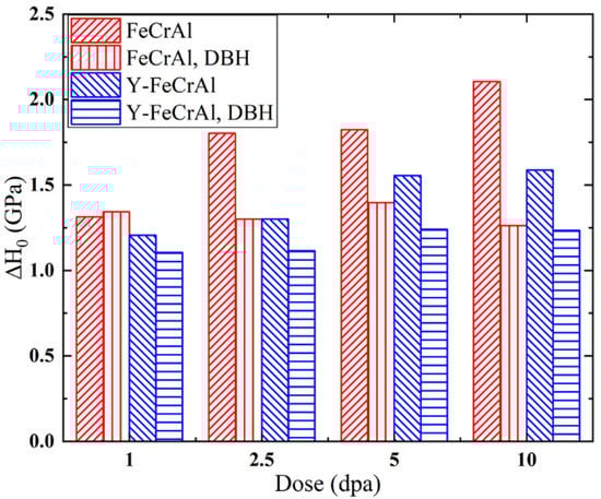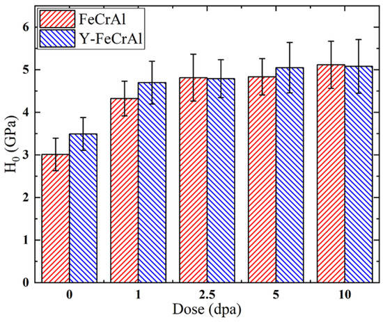 The hardness changes after irradiation represented by = (irradiated − unirradiated), are showed in Figure 10. Both of FeCrAl and Y−FeCrAl alloys increase with dose increasing. of FeCrAl alloys are slightly higher than that of Y−FeCrAl alloys under all doses. At the displacement damage of 1–10 dpa, the irradiation hardening are estimated to be 1.31–2.11 GPa in FeCrAl alloys and 1.21–1.59 GPa in Y−FeCrAl alloys.