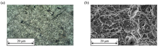 (a) Microstructure of AerMet 100 steel under optical microscope; (b) Fractography of AerMet 100 steel at magnification rates of 1000 under quasi-static tensile.