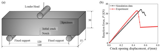 (a) Three-point bending test setups; (b) Comparison of the reaction force versus crack opening displacement between experiment and simulation.
