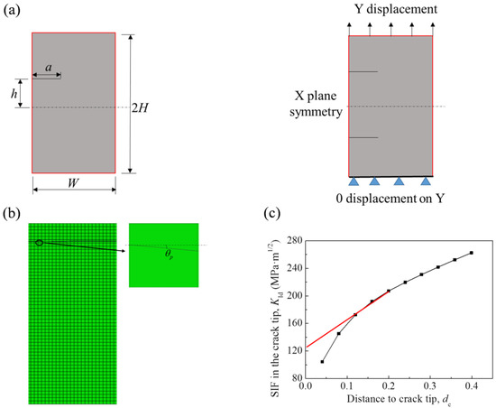 (a) Model with in-plane crack and boundary condition; (b) Calculation method of crack propagation angle; (c) Calculation method of SIF based on the extrapolation method.