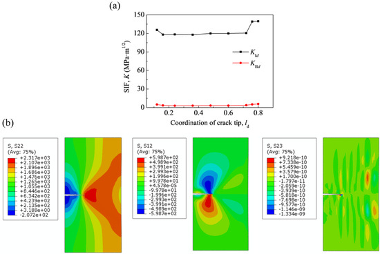 When the initial crack length li equals 0.1 at hi = 0, the crack grows along the middle line, and there is no deflection in the crack path. Based on the extrapolation method, the SIFs, i.e., KId, KIId, and KIIId in the crack tip in the crack propagation process could be calculated. KIIId stays at zero during the crack propagation (Figure 4a). Obviously, KId is larger than KIId and KIIId, evidenced by the stress contours of S22, S12, and S23 in the crack propagation process, with S22 much bigger than S12 and S23 (Figure 4b), where S22, S12 and S23 correspond to , and . The result implies that the fracture mode in this process could be regarded as the opening mode such that only KId would be discussed in the following study. In addition, KId shows a bigger value at the beginning and approaching the end while staying stable in the propagation process due to the boundary effect.