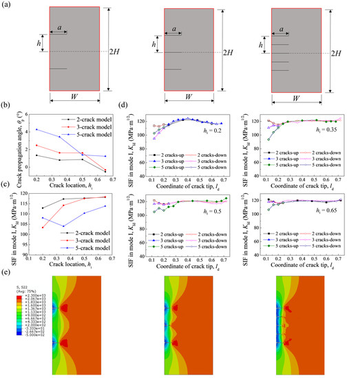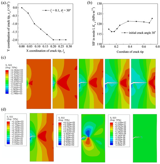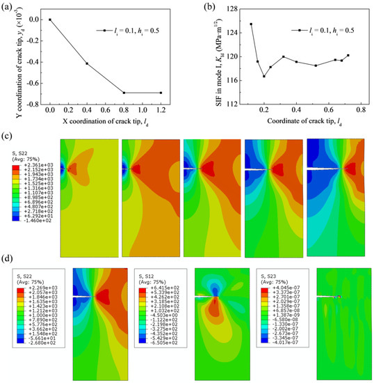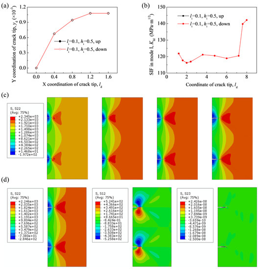 The existence of multi-cracks imposes significant influence on the crack propagation process. In the two-crack model with li = 0.1 and hi = 0.5, two cracks would not propagate simultaneously after some time due to the residual numerical error accumulation during the propagation process. Thus, only the beginning section is taken into consideration when two cracks propagate simultaneously. An outward deflection is observed and the Y coordinate of the crack tip shows a gradual increase (Figure 7a). The decrease of the deflection angle could also be explained based on the stress distribution in the stress contour, which is more asymmetric in the beginning than in the later propagation process (Figure 7c). Mode I fracture is observed since S22 is larger than S12 and S23 (Figure 7d). A steady plateau of KId is observed in the beginning, followed by a sharp increase in the end of the crack propagation procedure (Figure 7b). The sharp surge of KId in the end may be attributed to the influence of the boundary effect.