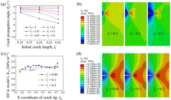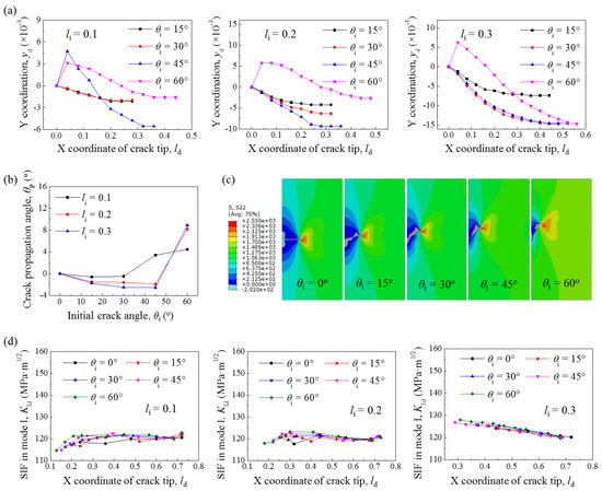In the FE model with different initial crack angles, the locations of all cracks tip experience an exponential decline and finally stay steady at a certain value (Figure 10a). The crack inclines inward gradually with the initial angle, while after reaching its lowest point, the inward crack propagation angle starts to increase and finally changes to an outward angle (Figure 10b). The combination of the change of the X and Y coordinates of the initial crack tip and the stress field in the plate model dominate the crack path, further evidenced by stress contour change (Figure 10c) with the initial crack angle ranging from 0° to 60° when li = 0.3. In general, KId of different initial crack angles is seldom influenced by the initial angle since the stress field does not change much (Figure 10d).