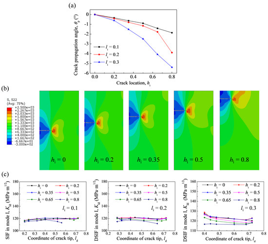 The crack propagation angle gradually becomes larger as the crack location changes from 0 to 0.8 in the crack length range li from 0.1 to 0.3 (Figure 9a). The crack propagation stays zero when hi = 0. The crack propagation angles increase from 0 to 1.86°, 3.89°, and 5.39°, respectively, in three lines of different crack lengths as hi increases from 0 to 0.8. The responsible reason should be the influence of hi on the change of stress distribution. Clearly, the asymmetry of the stress contour in front of the crack tip shows an increase with the increase of the crack location, namely the value of hi (Figure 9b).