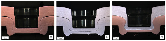 Cross-section of clinched joints: (a) Cu-Cu, (b) Al-Al, and (c) Al-Cu.