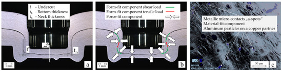 Joining by clinching produces a joint that can be characterized by the binding mechanisms form-, force-, and material-fit. The form-fit component of a clinched joint is determined by the clinching tools (punch and die) and the materials to be joined (mechanical properties and thickness). The force-fit component is determined by the spring back effect after the removal of the joining tools. An existing material-fit component can be generated by the material properties of the joining partners and the joining parameters such as penetration depth and process force. Regarding the mechanical requirements of the clinched joint, the characteristic parameters (Figure 2a) such as neck thickness (tn) and undercut (f) are used for the design of clinched joints as a function of the bottom thickness (tb). The geometrical parameters of this joint can characterize the binding mechanism form-fit of a clinched joint as a function of the main mechanical load direction (Figure 2b). However, the geometric parameters are not suitable for designing a clinch joint in terms of electrical conductivity. For a long-term stable transmission of electrical currents, the force-fit component, and a possible material-fit component, which can occur under certain conditions, here using the example of a mixed joint of aluminum and copper in the neck area (Figure 2c), are more important.