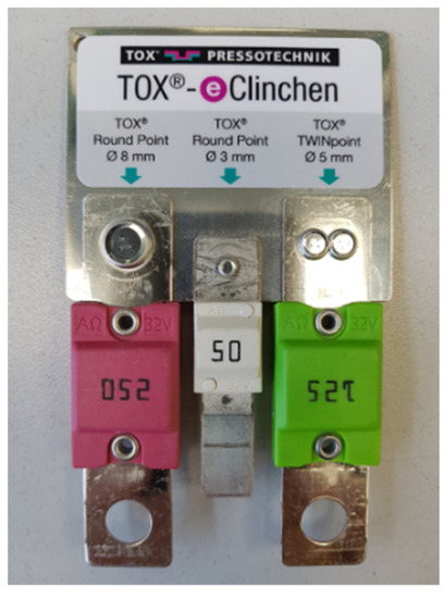 A foreseeable demand seems to be the function of electrical contact in joining technologies because of many advantages (e.g., no heat input) and the trend toward increasing electrification of automobiles, as referenced in [3], or battery packs according to [4]. Another application in the field of electromobility is the clinching of fuses with bus bars (Figure 3).
