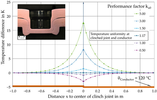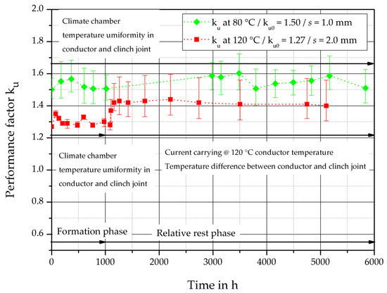 In a second test series, the samples with a thickness of 2.0 mm each were first subjected again to a constant thermal load in the climate chamber at a temperature application of 120 °C (Figure 8). After a period of 1000 h, the load in the climate chamber was terminated. Further thermal loading was carried out on current-fluxed conductors, whereby a temperature of 120 °C was set in the homogeneous conductor by the test current. As a result of the initial performance factor of ku0 = 1.3, a slight temperature difference between the clinched joint and the homogeneous conductor occurs (compare Figure 5). This temperature difference leads to an increased performance factor, and it stabilizes at a value of 1.4 and does not change anymore until the end of the load after 4000 h, so the marginally increased temperature does not affect the electrical behavior of the clinched joint. With this type of loading, long-term stable behavior of the clinched joints could also be observed.