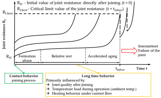 After joining, the formation phase begins in which the resistances increase slightly as a result of the first heating depending on the contact behavior of the respective conductors and the construction of the joint, or also decrease, for example, in the case of coated contact surfaces. This is followed by the phase of relative stability, which should cover the entire required service life for a joint with long-term stability. During this period, an infliction point is reached and the joint resistance changes only slightly. In the area of accelerated aging, the resistance of the joint increases significantly until its failure occurs. In addition to the quality of the assembly and the load acting on the joint, the relevant physical aging mechanisms are decisive for the aging process. The five aging mechanisms are force reduction by stress relaxation and/or creeping, chemical reactions (galvanic corrosion, oxide layer formation), which are particularly relevant for the investigated joints [7], inter-diffusion, which can occur in contact partners made of different metallic materials, and electro-migration as well as friction wear are known.