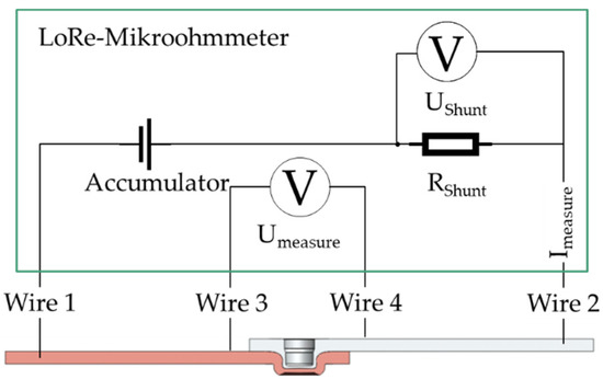 A micro-ohmmeter (LoRe, Werner GmbH, Kreischa, Germany) is used to inject a direct current Imeasure into the specimen via wires 1 and 2 and measure the voltage drop across the clinched joint through wires 3 and 4, taking into account any thermoelectric voltages that occur. With the injected measuring current Imeasure and the measured voltage drop Umeasure, the connection resistance is calculated via Ohm’s law. In addition, the temperature of the joints was determined to calculate the resistance converted to a reference temperature of 20 °C from all variables.