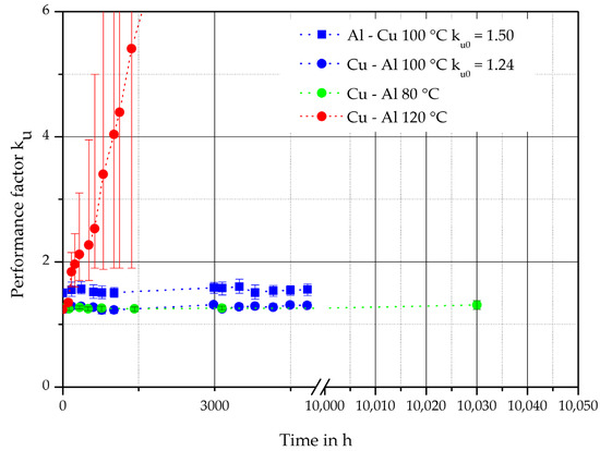 At temperatures of 80 °C and 100 °C, the force dissipation in the joint is low and there is no influence on the joint resistance and, thus, the performance factor during this period. At a temperature load of 120 °C, the performance factor increases significantly even after a very short load duration (Figure 9), so that the performance factor in the electrical test reaches a value of ku = 27.95 after 5000 h, which, from an electrical point of view, represents a failure of the connection. These joints failed due to the significant mechanical stress reduction (reduced force-fit component) between the joining partners caused by reaching the temperature limit in the deformed aluminum. This stress/force reduction between the conductors leads to an increased contact resistance Re, according to Equation (1).