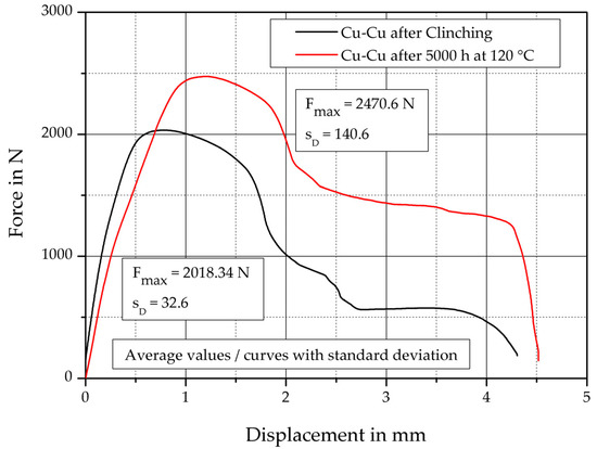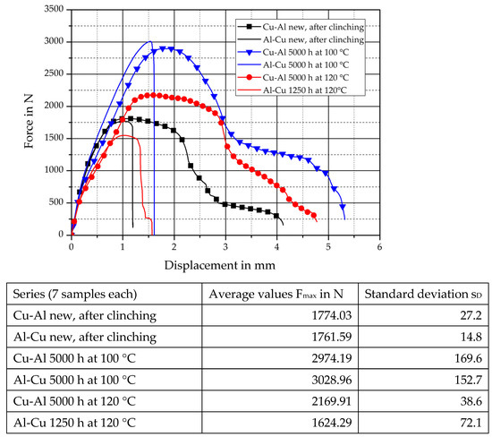 In the case of mixed joints with conductors made of aluminum and copper (Figure 11), the test load is increased by 70% in comparison to the initial state when the aluminum material is arranged on the punch side after complete aging for 5000 h at 100 °C, which is attributable to the onset of precipitation hardening. After loading at 120 °C, there is a significant drop in the test load, which indicates a stress reduction within the aluminum material. The failure diagrams in Figure 11 for this joining part combination show nearly identical failure behavior. All combinations failed due to neck breakage (material failure) without previous deformation of the punch-side material at the clinched joint. Due to the undefined heat treatment during aging and the inhomogeneous microstructural changes at the clinched joint, the standard deviation increases.
