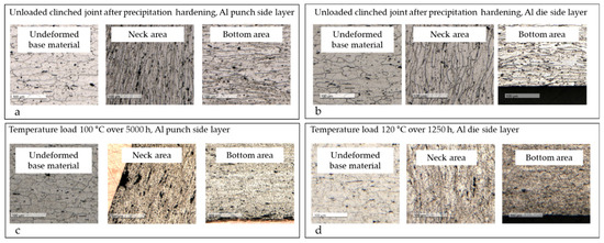 If a thermal load of 100 °C is now applied for 5000 h, a change can be seen in Figure 12c in all three areas. The grain shape and grain orientation in the base material remain unchanged, and only primary precipitations occur. The grain orientation can still be seen in the neck and bottom areas, but the grain boundaries are difficult to identify. A load-related structural change has taken place here, but this does not hurt the long-term behavior of the clinched joint regarding the electrical properties in Figure 9. The operating temperature limit is not reached.