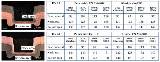 Due to the large deformation of the joining materials, the recrystallization temperature is reduced. In this case, the load temperature is higher than the operating temperature limit. Figure 12d shows the microstructural changes that occurred in the specimens in the aluminum material on the die side, which caused the reduction in the force-fit component between the joining partners. By using hardness measurements (Figure 13), it can be determined that there is no change in hardness at a load of 100 °C in the copper material (Cu-ETP). About the aluminum material on the die side, there is a slight increase in hardness in the unformed base material, which can be attributed to the incipient precipitation hardening effects. There is no change in hardness in the neck area, where cold hardening is superimposed with a slight reduction in stress, whereas in the bottom area, despite cold hardening, there is a slight loss of hardness, but this does not affect the long-term behavior.