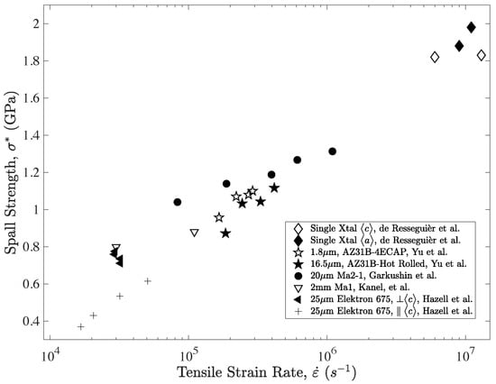 Figure 2. Spall strength as a function of tensile strain-rate determined from time-resolved velocimetry measurements on pure and alloyed Mg from the open literature. Reproduced or adapted from [41,107,108,109,110].